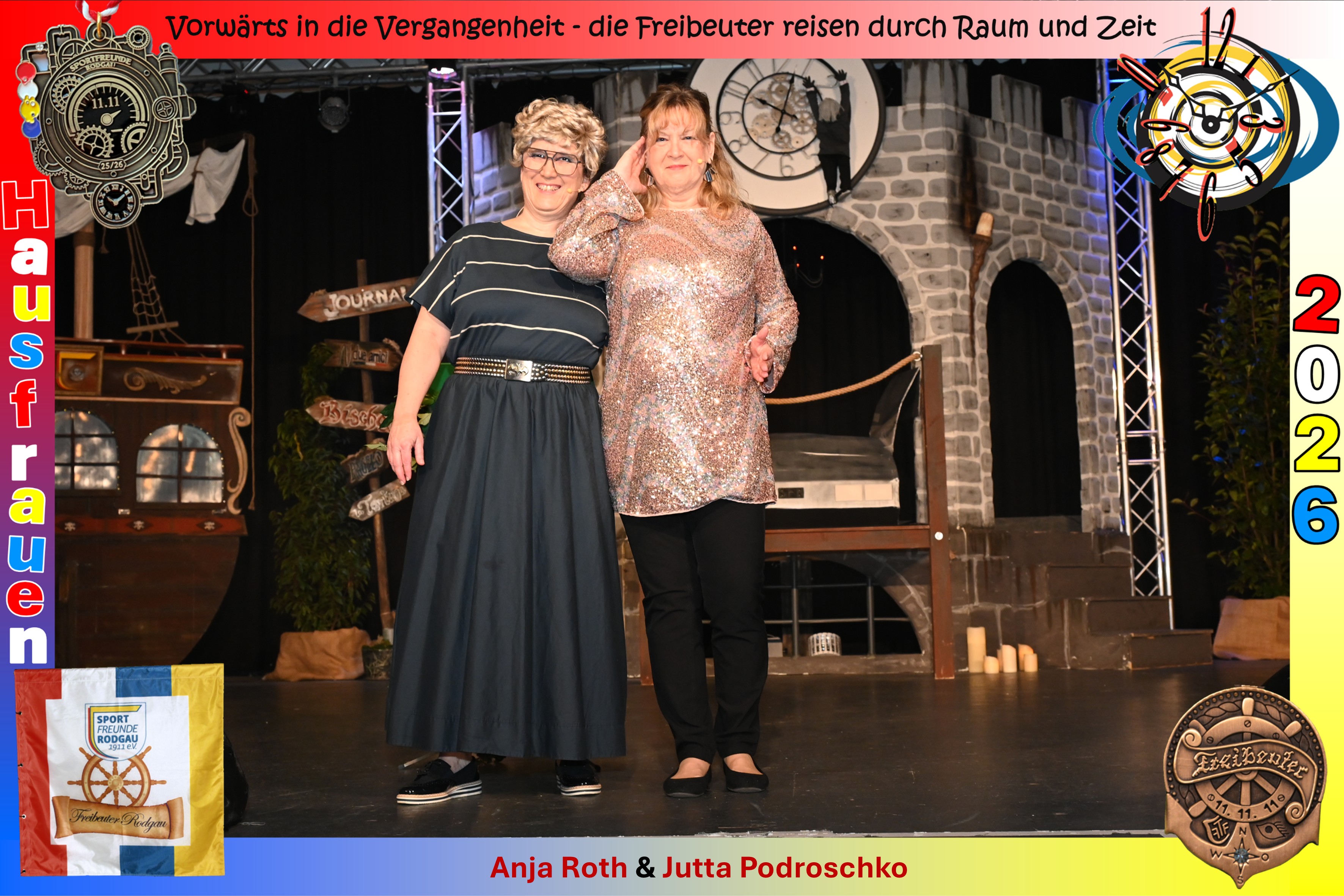 Als nächstes betraten Anja Roth und Jutta Podroschko die Bühne. Jutta war versehentlich in die Zeitmaschine gefallen und als „KI“ wieder herausgekommen. Sinnvolle Gespräche konnte man da nicht mehr mit ihr führen. Anjas Schrulligkeit und Schokolade machten Jutta zeitweise wieder normal. Doch auch da zieht sie Anja auf: Der Unterschied zwischen ihr und einem Nilpferd? „Das eine hat einen großen Hintern und ein großes Maul und das andere lebt im Wasser.“ Auch brauche sie keinen Hautarzt, „denn schuppige Haut ist bei Drachen normal.“ Als Anja am Ende brüllte: „Mensch KI, fahr doch zur Hölle!“ antwortete Jutta nur sachlich: „Die Route nach Dudenhofen wird berechnet.“