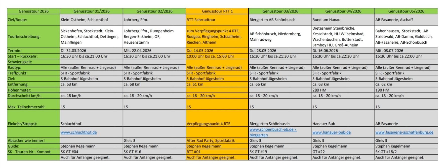 Hier eine Übersicht über unsere Radtourenangebote. Die offiziellen Touren werden in der Vereins-App als Termin eingestellt. Bitte darüber auch buchen.